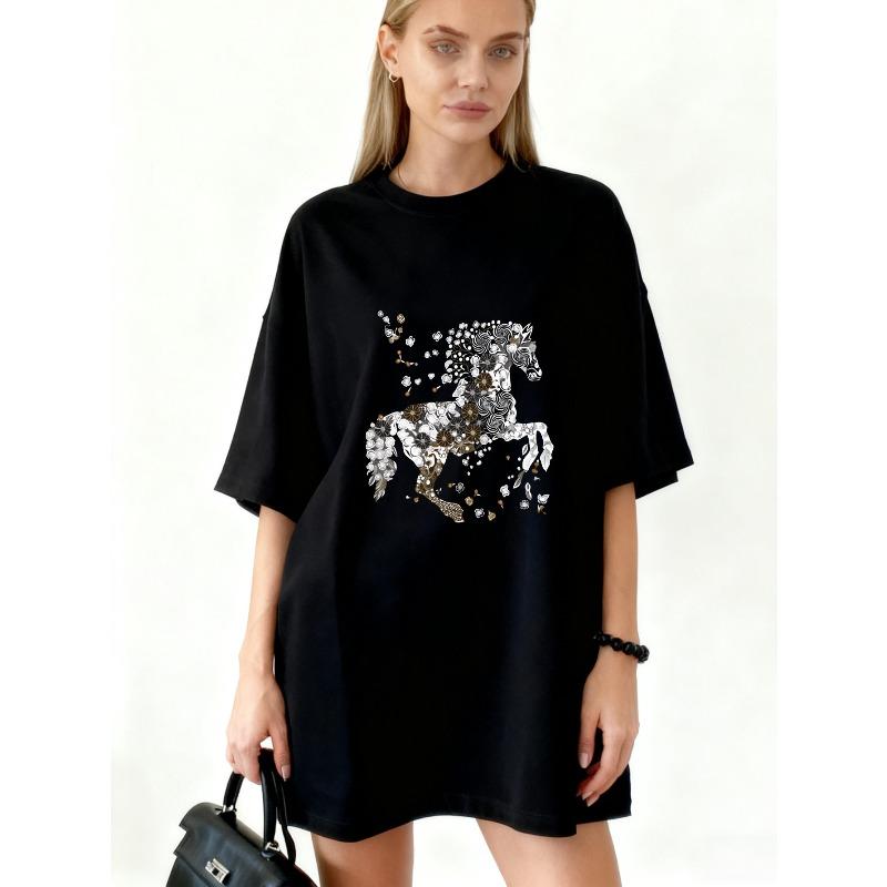 Übergroßes T-Shirt Kleid Schwarzes Pferd Musterdruck Lässig Streetwear Mode Damen Oberteil