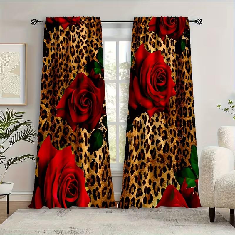 2 Pcs Leopard print rose print curtains,suitable for bedroom,living room kitchen decoration,home decoration,window decoration