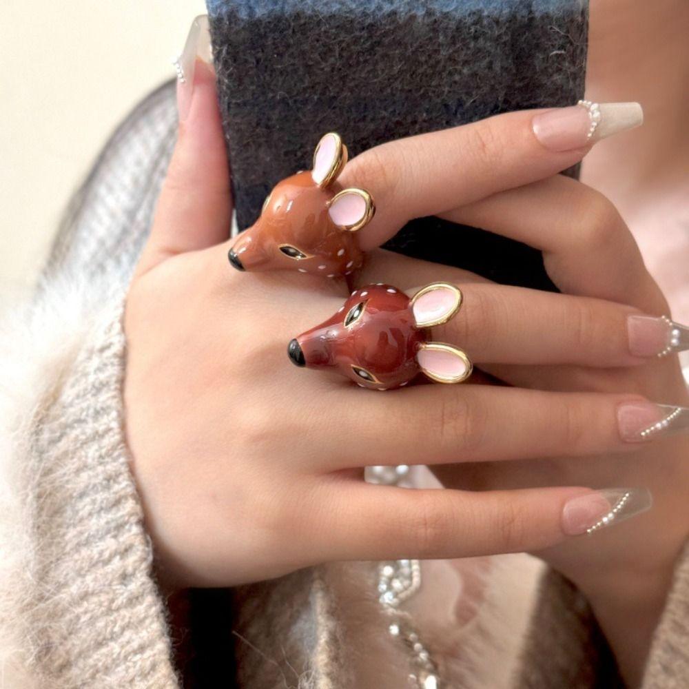 Brown Deer Drip Oil Ring Geometric Chunky Animal Ring Personality Enamel Ring Gift