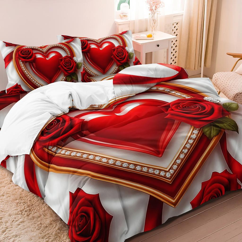 3-teiliges Romantisches Herzförmiges Rosenmuster Partner Bettbezug-Set zum Valentinstag, Bettwäsche-Set, Weicher Und Bequemer Bettbezug
