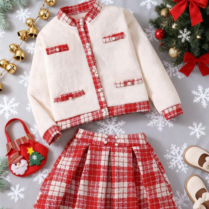Süßes Mädchen-Set: Herbst Kinder Mode Roter Karorock & Florale Kurzarmjacke Zweiteiliges Set