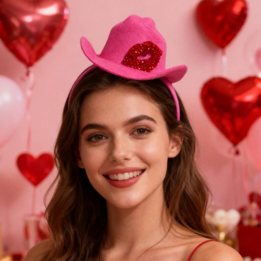 Filz Rosa Cowboyhut Stirnband Kunststoff Glänzender Lippenabdruck Haarband Valentinstag Haarreif Frauen