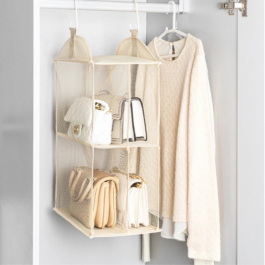 Neue Faltbare Aufbewahrungstasche für den Kleiderschrank Transparent Hängender Handtaschen-Organizer Mehrlagig mit Haken Aufbewahrungsbeutel Kleiderschrank