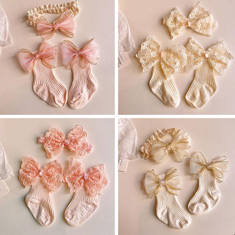 2Pcs Baby Bow Headband Socks Set Toddler Boys Girls Lace Print Bowknot Elastic Hairband Turban Solid Soft Sock Kids Accessories