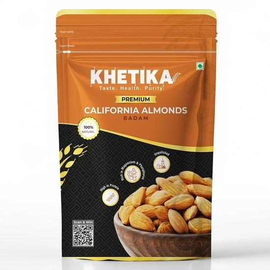 Khetika Premium California Almonds 500g | Almonds, Badam, Badam Giri, Rich in Fiber, Boost Immunity, Healthy Nutritious Snacks, Whole Crunchy