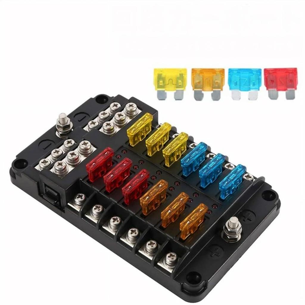Car Boat Fuse Box Holder with Waterproof LED Warning Light ATO ATC Block Blade Fuses View Kit Stickers DC for Trikes 12-Way Kit, Fuses, 5A, 10A, 15A,