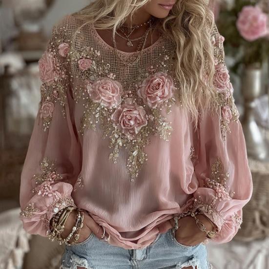 Women Tops Round Neck Long Sleeve Loose Fit Tee Shirt 3D Flower Printing Faux Pearls Decor Pullover Tops Casual Office Wear