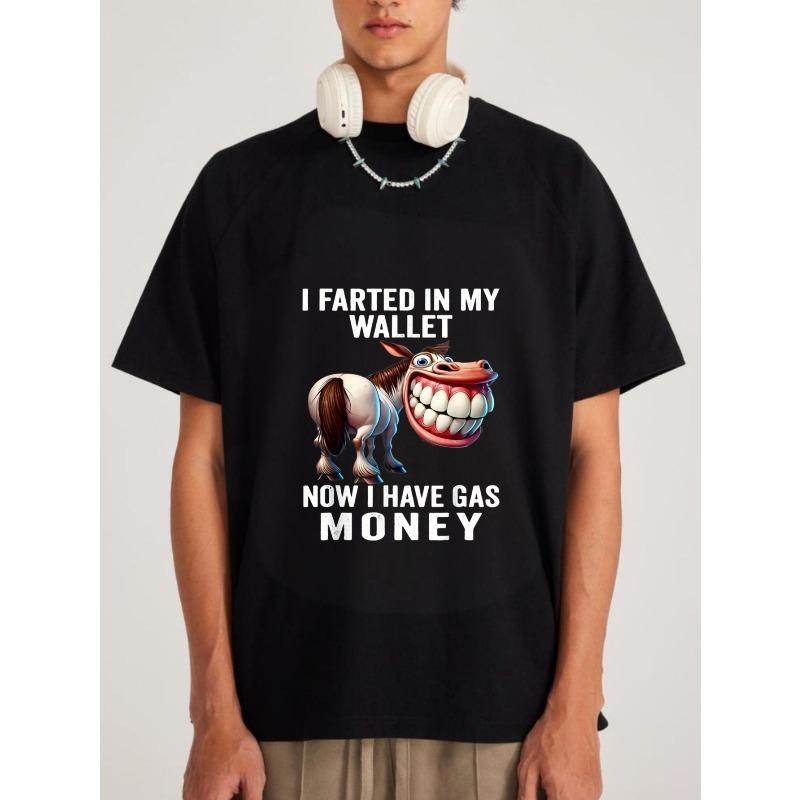 Rundhals T-Shirt Weißes Pferd mit großem Lächeln und Text Ich habe in meine Brieftasche gefurzt Jetzt habe ich Benzingeld Freizeitkleidung für Männer und Frauen