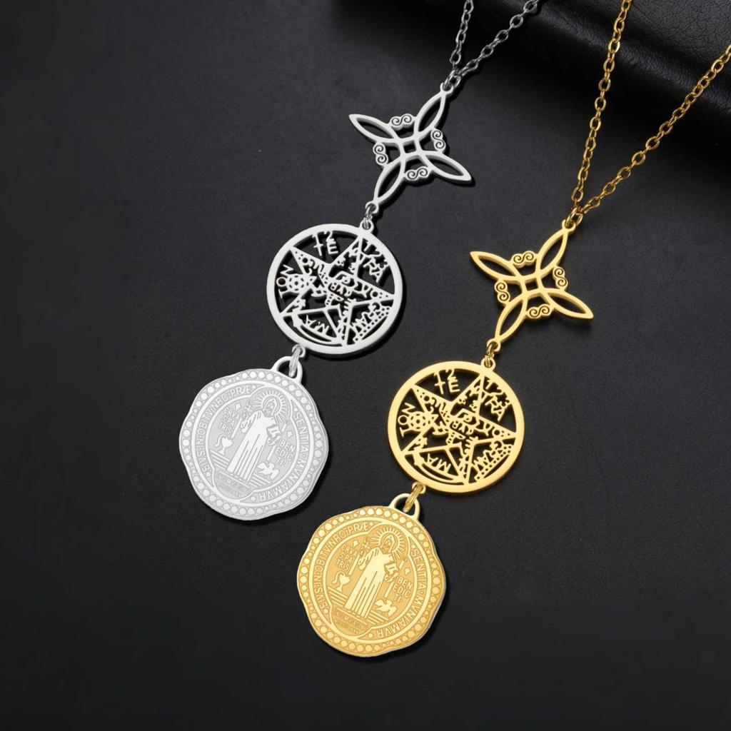 St. Benedikt Pentagramm Halskette Edelstahl Hexenknoten Religiöser Schmuck mit Tetragrammaton Symbol für Schutz