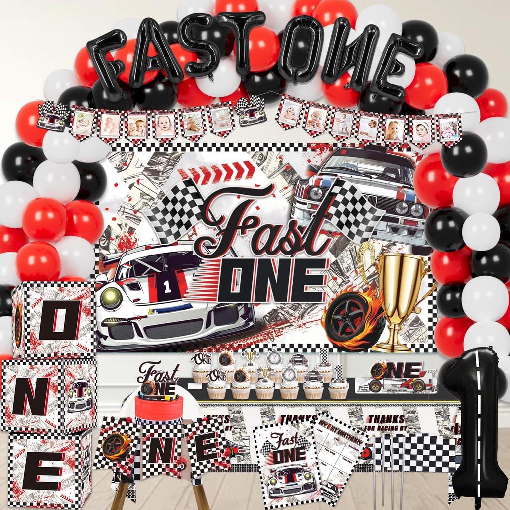 Fast One Birthday Decorations, 125 Pcs Race Car First 1st Birthday Party Supplies for Boys Baby - Banner, Cake Toppers, Balloons, Tablecloth,