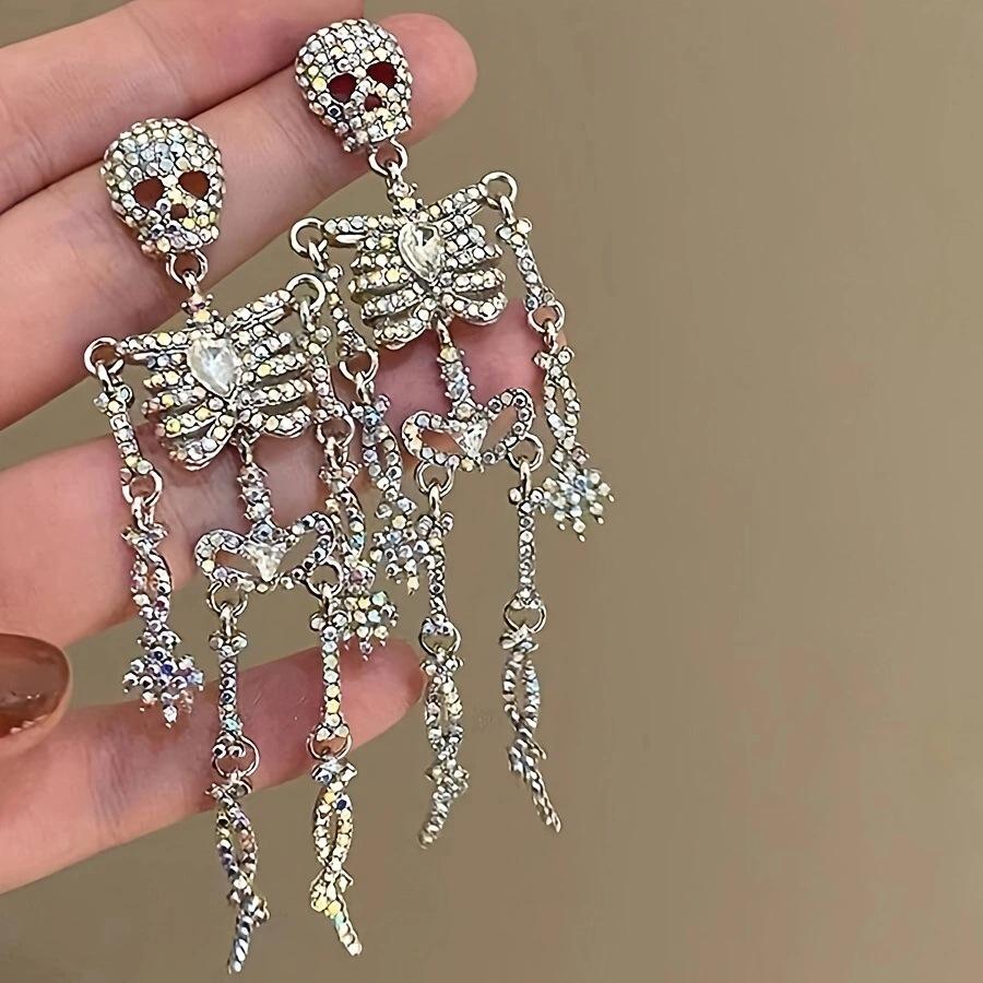 Light Luxury Full Rhinestone Skull Earrings for Women Exaggerated Skeleton Pendant Earrings Halloween Party Jewelry Gift