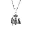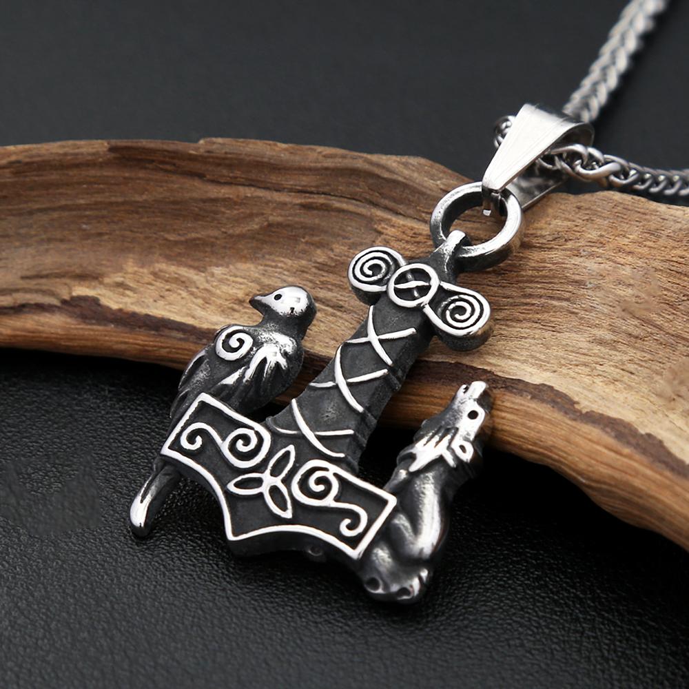 Vintage Viking Thors Hammer Pendant With Wolf And Raven Necklace For Men Stainless Steel Nordic Amulet Jewelry