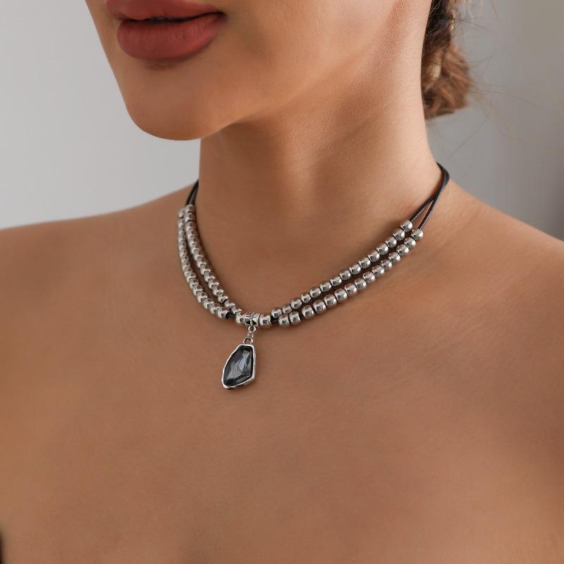 New Irregular Gray Crystal Pendant Necklace for Women Double-layer Beads Leather Strap Choker Sweater Chain Party Jewelry Gift