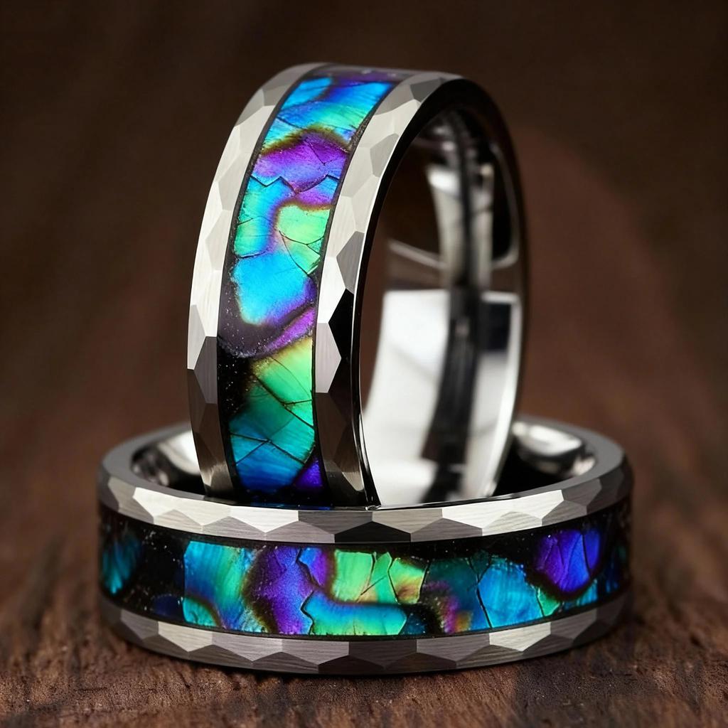 8MM Gehammerte Edelstahlringe für Männer Frauen Einlage Bunte Abalone-Muschelringe Männer Hochzeitsparty Schmuck Geschenk