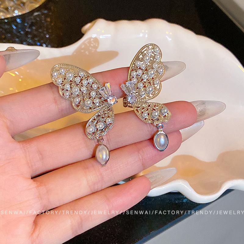 Miniature zircon pearl butterfly earrings, femininity, pierced earbone clip earrings.