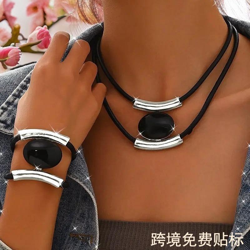 Halskette Armband Set Schwarzer Acryl Anhänger Mehrlagig Retro Schlichter Schmuck