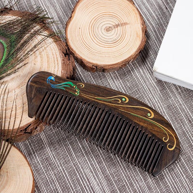 Tan Mujiang Peacock Feather Lacquer Wooden Comb Gift Set