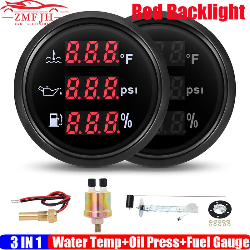 Digital 3 IN 1 Multi Meter Red LED 52mm Water Temperature Gauge+Oil Pressure+Fuel Level Gauge with Sensor 240-33ohm Boat