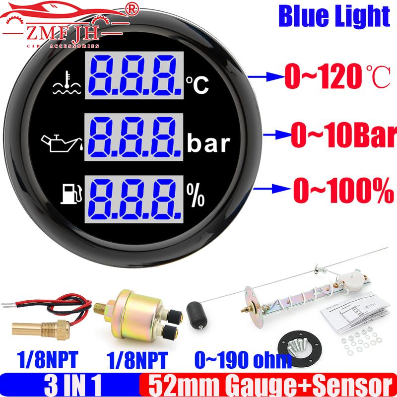 ZMFJH Blue LED Digital 3 IN 1 52MM Water Temperature Gauge+Oil Presssure+Fuel Gauge with Alarm Sensor Set for Car Boat 12V24V