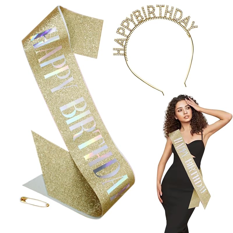 LIKENNY 3-Piece Birthday Headband, Sash, and Brooch Set, Sparkly Birthday Cake Decorations, HAPPY BIRTHDAY Party Supplies, Anniversary Celebration