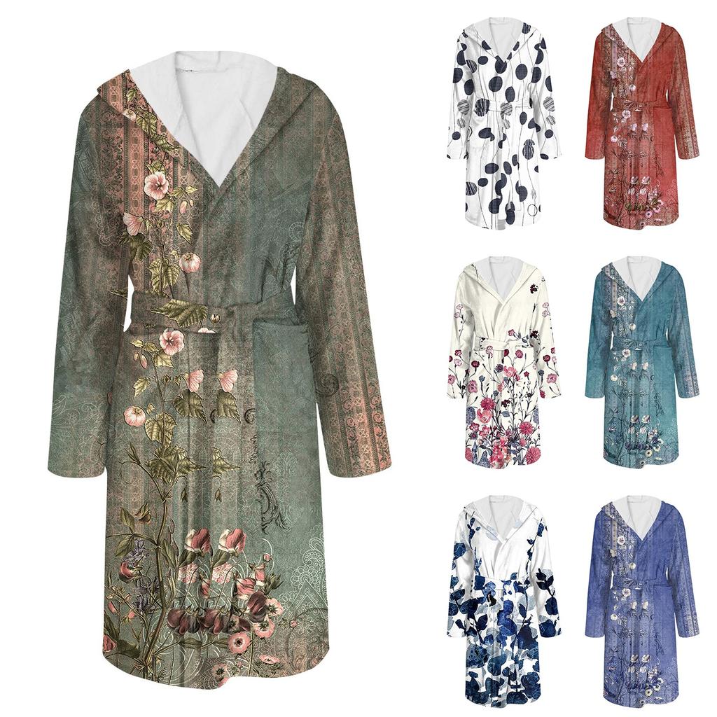 Flanell-Bademantel für Damen und Herren, lange Länge, Blumenmuster, Schnelltrocknend und Saugfähig, Geeignet für Alle Jahreszeiten, Frühling, Sommer, , Winter,