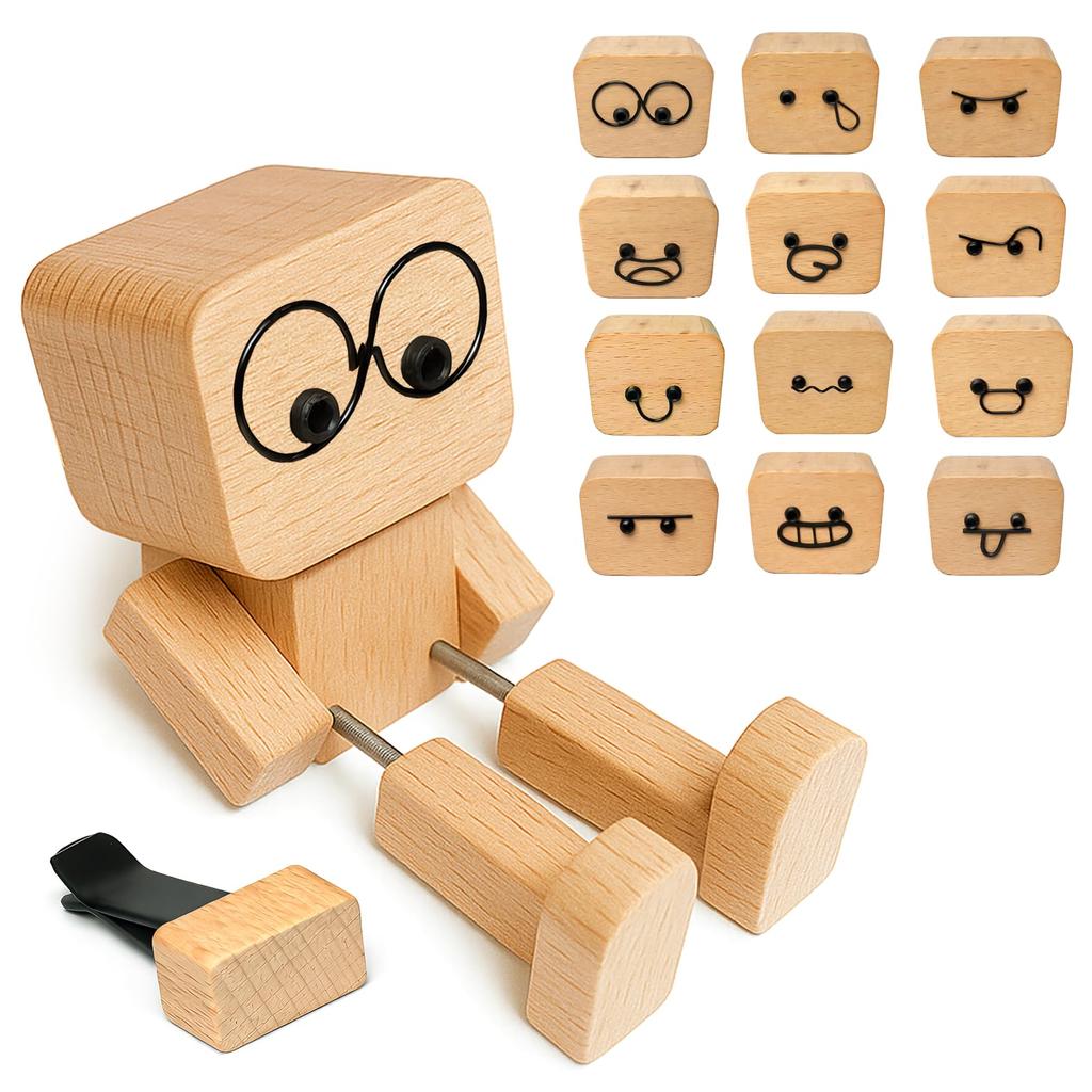 Wackelnde Füße Holzpuppe mit Federbeinen & 12 Stk. Magnetische Ausdrücke, DIY Kreative Ornamente, zur Dekoration des Armaturenbretts