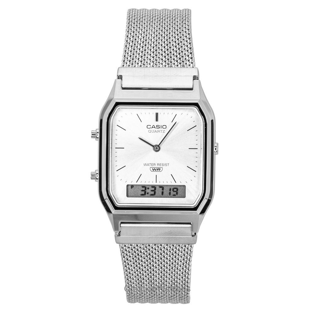 Casio Vintage Analog Digital Stainless Steel Mesh Bracelet Silver Dial Quartz AQ-230EM-7A Unisex Watch