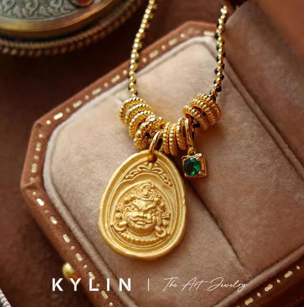 Xiaohongshu Bestseller: Gelber Wohlstandsgott geflochtene Halskette mit Blattgold und schwarzem rundem Anhänger im neuen chinesischen Stil.