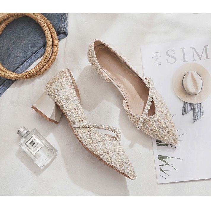 Einzelne Schuhe Damen dicker Absatz sanfter kleiner duftender Wind Perle Seite leer Frühling und Sommer Wind Fee flache Öffnung High Heels