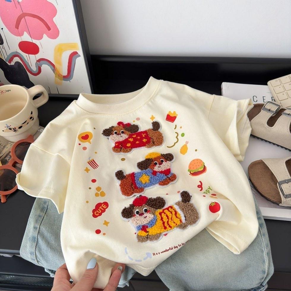 Sommer-Ankunft: Kinder Cartoon besticktes Baumwoll-T-Shirt (Kurzarm, Lockere Passform, Koreanischer Stil)