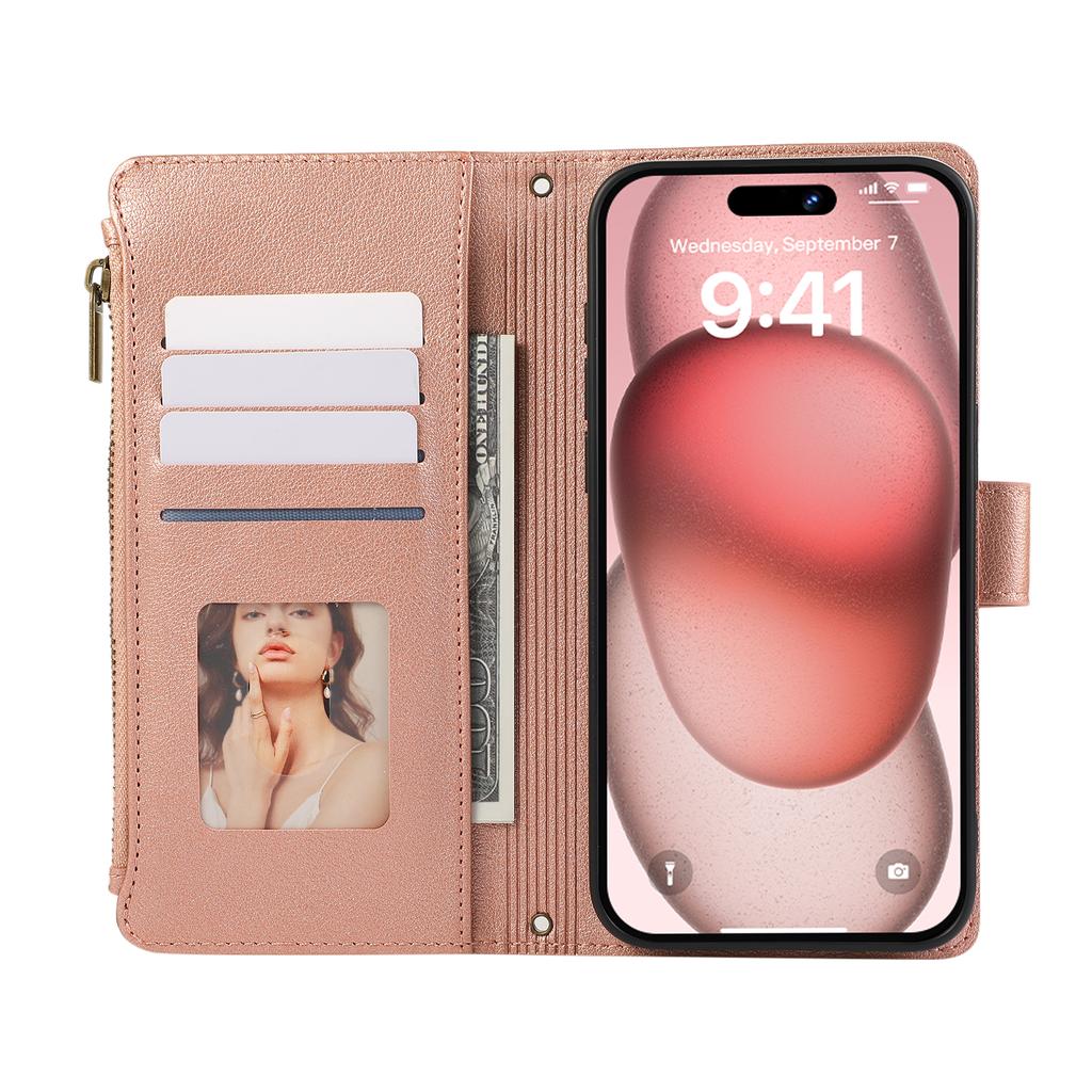 Für iPhone 15 Pro Max Hülle Mehrere Kartenfächer Reißverschluss Leder Handyhülle mit Handschlaufe