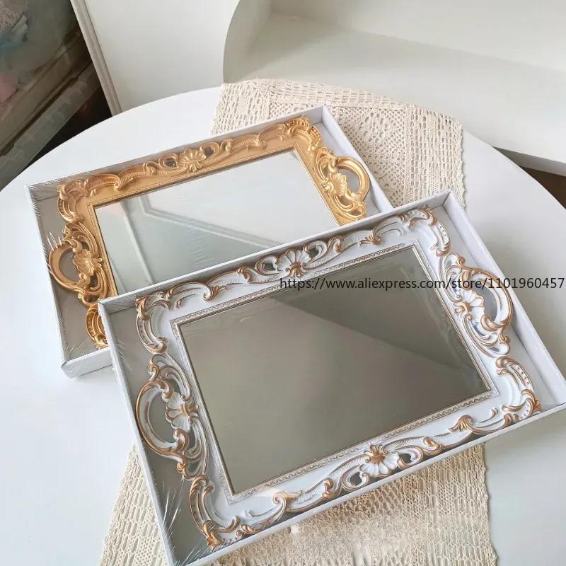 Französisches Retro Weiß Geprägtes Spiegel Tablett Wohnzimmer Tisch Tee Tablett Minimalistisches Kosmetik Schmuck Aufbewahrungstablett Hochzeitsdekoration