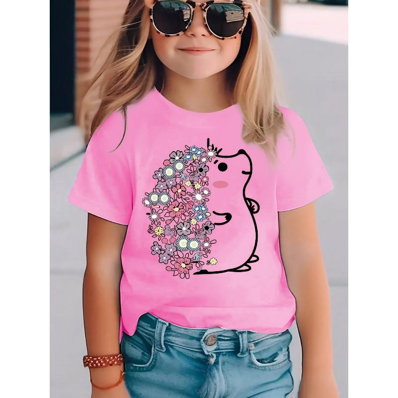 European sizes Summer Fashion Short Sleeve T-Shirt for Girls Featuring a Hedgehog Cartoon Design Filled with Flowers