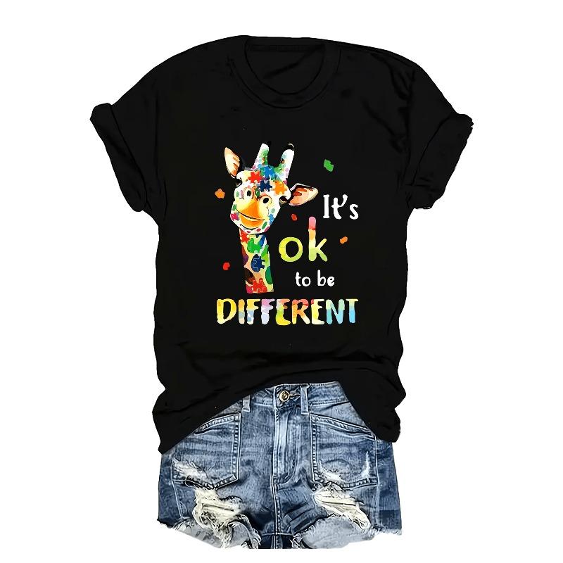 Damen Große Größen Buntes Hirsch & OK DIFFERENT Buchstaben Druck T-Shirt Rundhals Lässiges Oberteil