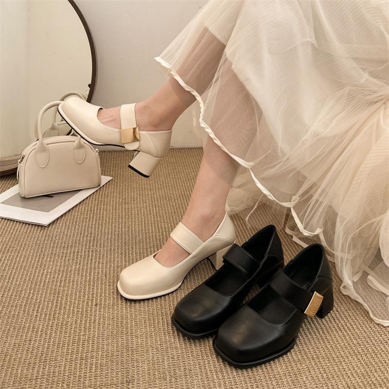 Retro thick heel light mouth single shoes spring and autumn height increase small leather shoes versatile square head Mary Jane high heels