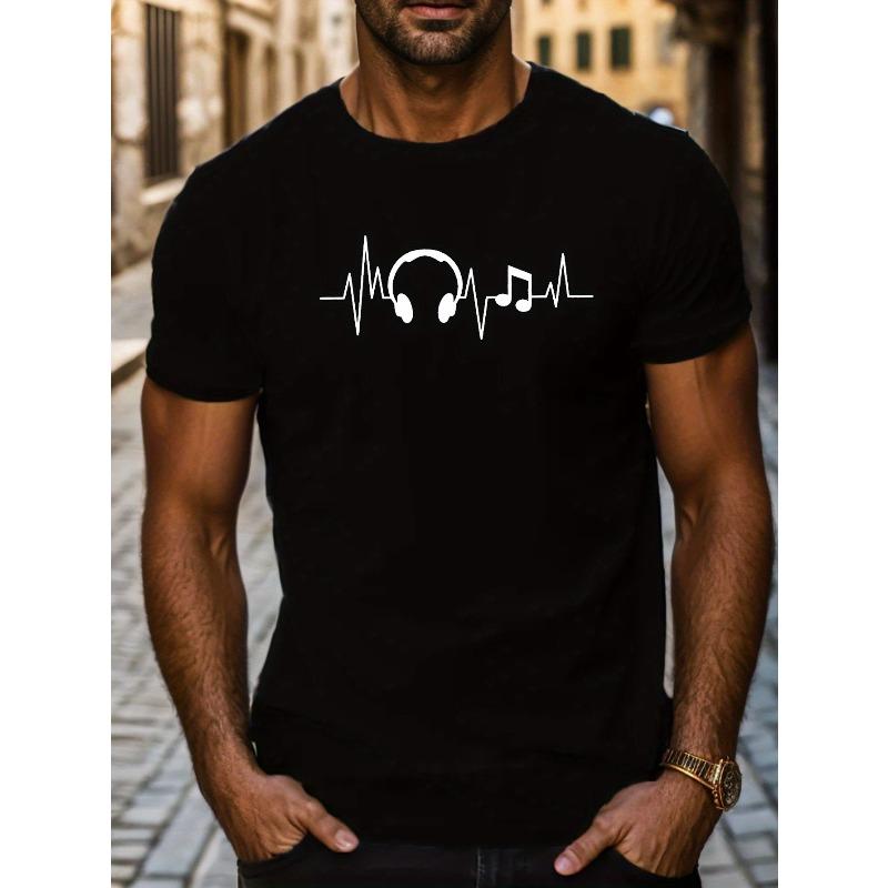 Europäische Größen Kopfhörer Musiknoten EKG-Druck Kurzarm-T-Shirts Für Männer, Lässiges Rundhals-T-Shirt, Bequemes Atmungsaktives T-Shirt