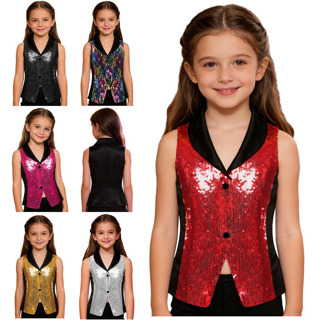 Mädchen Performance Weste Top: Pailletten- und Satinweste mit V-Ausschnitt, einfache Druckknöpfe für schnelle Kostümwechsel