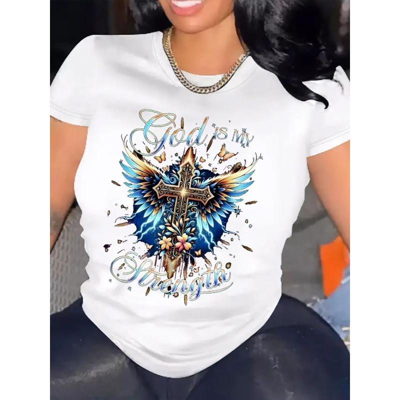 Europäische Größe Gott ist meine Stärke Damen T-Shirt Bequem Rundhalsausschnitt Lässig Mischgewebe Kurze Ärmel Weich Atmungsaktiv Oberteil Damenmode T-Shirt Sommer
