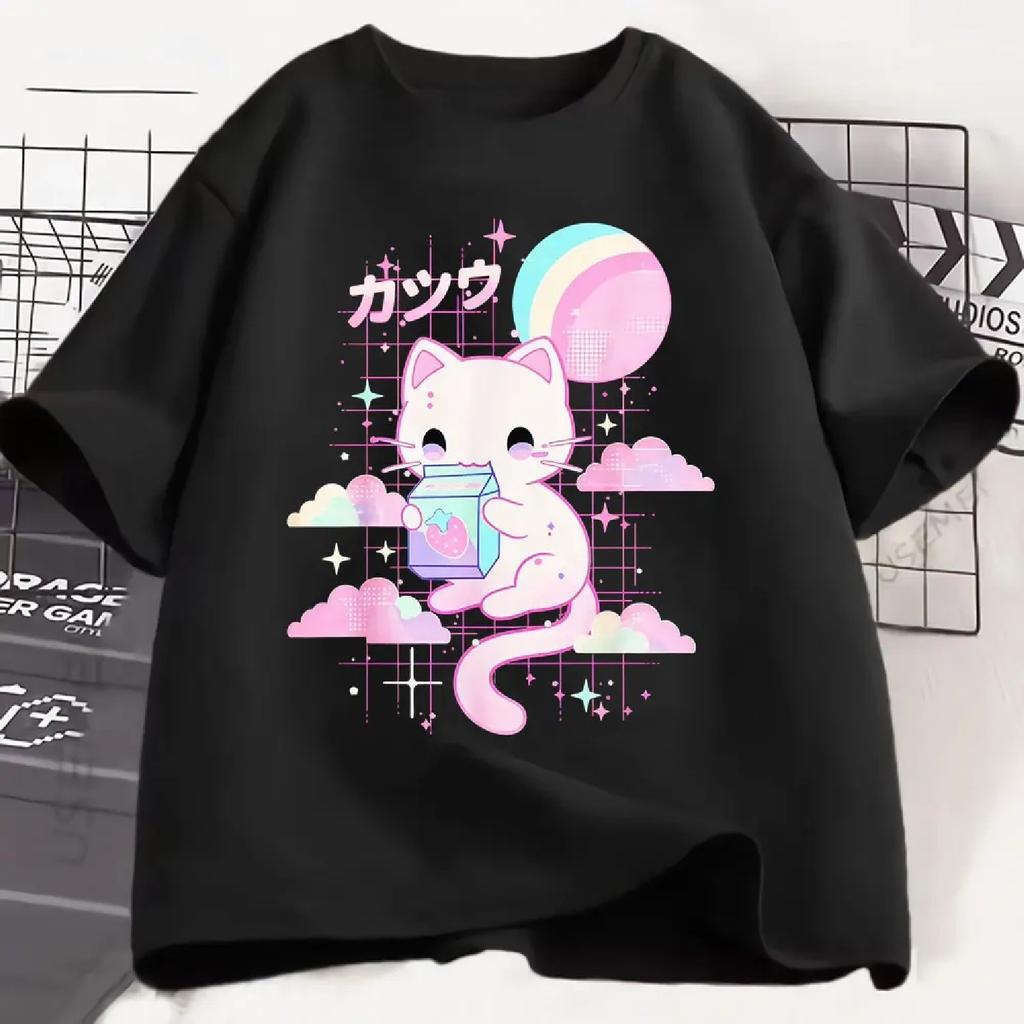 Cat Strawberry Milk Anime Japanese Tshirt Summer Hip Hop Unisex Oversized Tee Shirt Mens Women High Quality Clothing Y2k Clothes