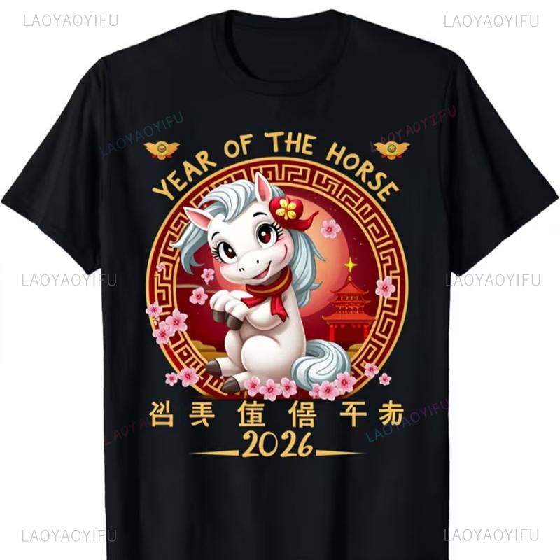 2026 Year of The Horse Chinese Zodiac TShirt Lucky Fortune Black Short Sleeve Y2k Top Aesthetic Clothes Kawaii Clothes Tops
