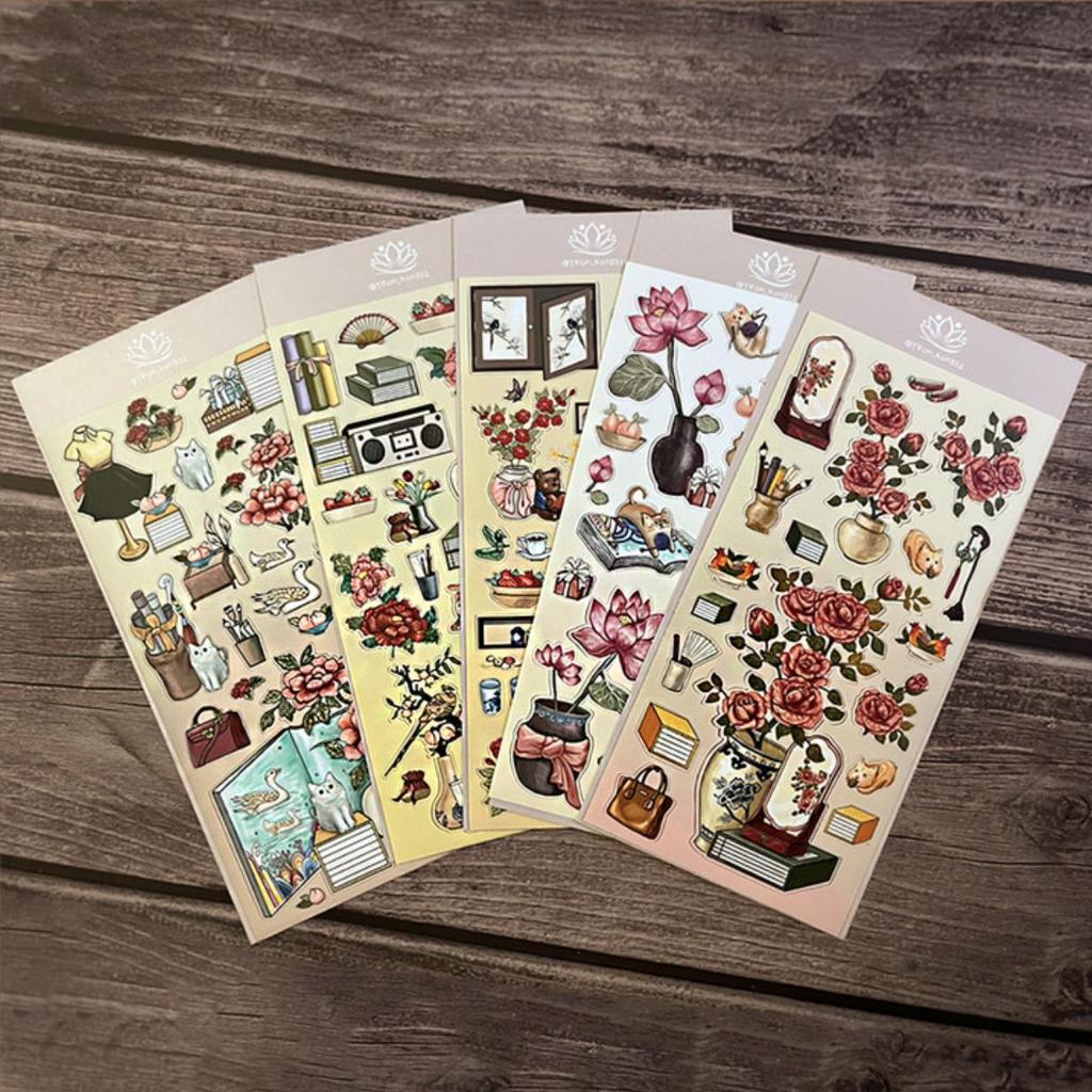 Vintage Koreanisches Minhwa Abnehmbares Sticker-Set - 5 Einzigartige Bögen (1 Packung)
