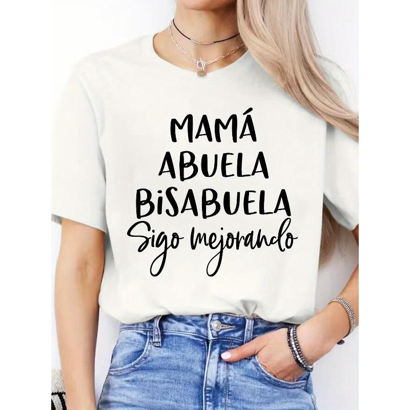 Europäische Größen Damen Spanisches Alphabet - Print T-Shirt - Spanischlernen, Lässige Kurzarm-Rundhalsbluse