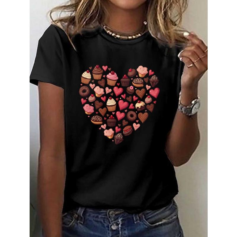 Damen Herz Cupcake Schokoladenprint T-Shirt Lässig Rundhals Kurzarm Ganzjahres Oberteil