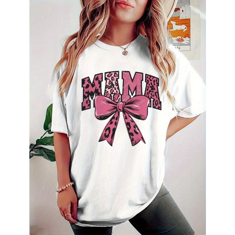 Europäische Größe Damen Übergröße Grafik-T-Shirt Weiches Stretch-Rundhals-T-Shirt mit MAMA Schleifen-Design in Schwarz & Rosa Leopardenmuster Lässig für jeden Tag