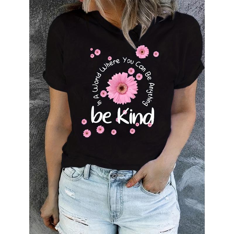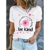 Women Crew Neck Short Sleeve T-shirt Flowers Letter Be Kind Print Casual Daily Wear Top