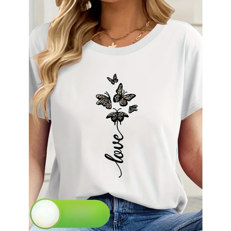 European Size Women's Casual Short Sleeve T-Shirt with Butterfly & Love Script Graphic Print, Round Neck Breathable Summer Tee, Casual Attire