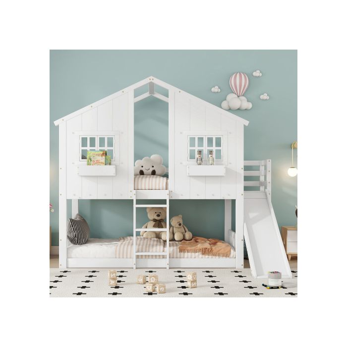 Etagenbett mit Rutsche, mit Dach und Fenster, mit Rausfallschutz, mit dreifacher Leiter, Kiefer + MDF, Weiß, 90x200 cm