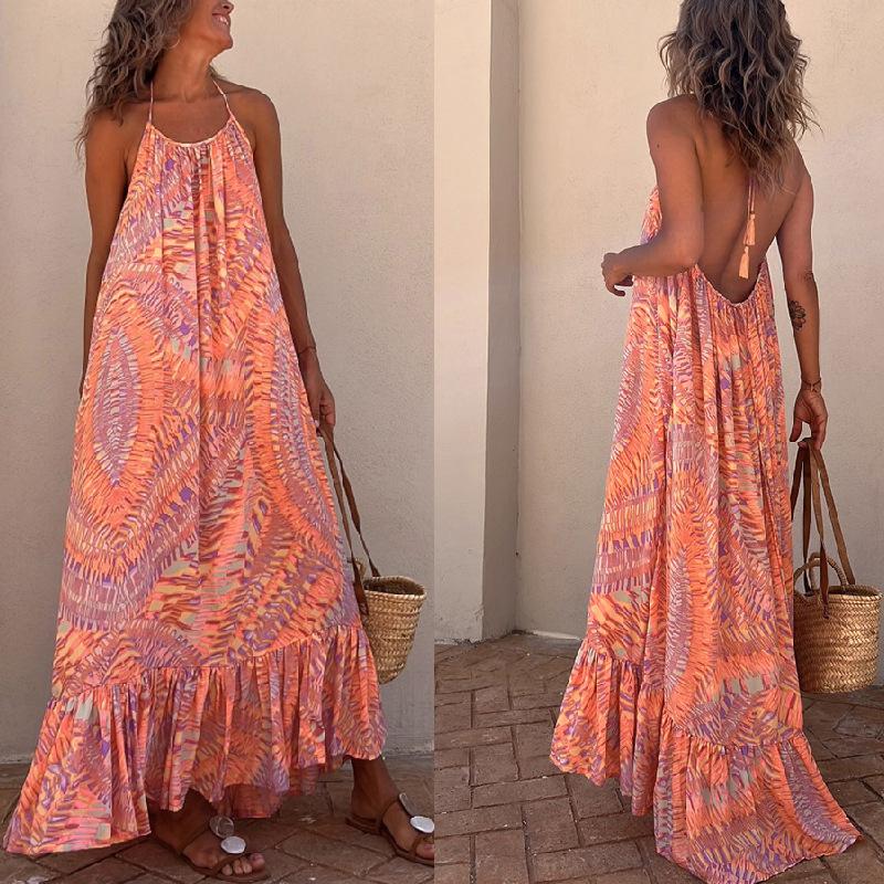 European & American Summer 2023 Women's Printed Spaghetti Strap Long Dress with Big Hem