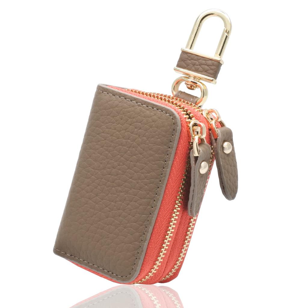 KNUTe Damen Doppeltes Smart Key Case, Platz für 2 Schlüssel, Echtes Leder, Beidseitig, Niedlich, Gedämpfte Farbe, Narbiges Leder, Reißverschlussabdeckung, Karabiner