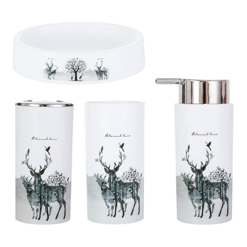 4er-Set Badezimmer-Organizer mit Hirschmotiv, inklusive Zahnbürstenbecher, Seifenschale und Flüssigseifenspender für das Badezimmer zu Hause